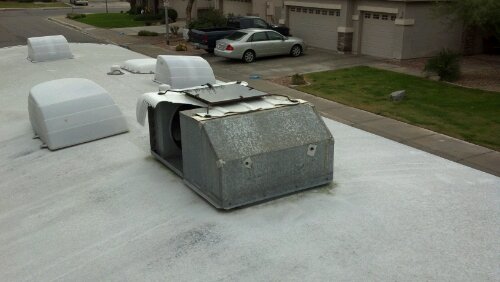 Traveling along west Texas there’s a very windy section of highway near the I-20 and I-10 junction. Last year it laid waste to a cracked spoiler on my GMC Sierra, this year it claimed the shroud on the roof air conditioner unit. I’m sure it was brittle, but it got shredded! We heard a bang and whistling in the front of the RV, we pulled over and I walked the perimeter but did not look at the roof. Next morning after we got home we found out, holy cow! 🙂