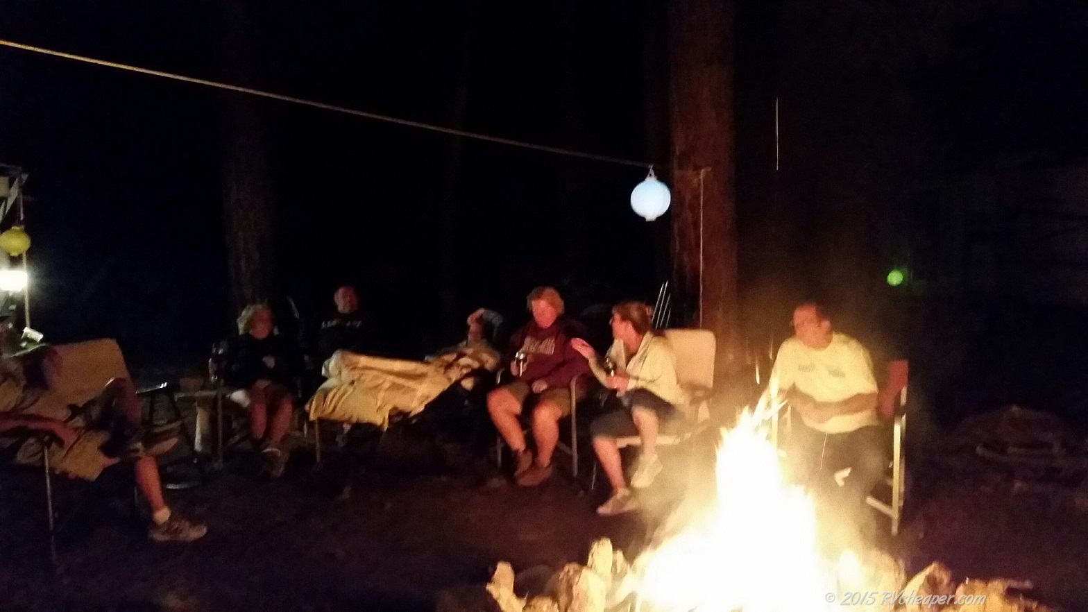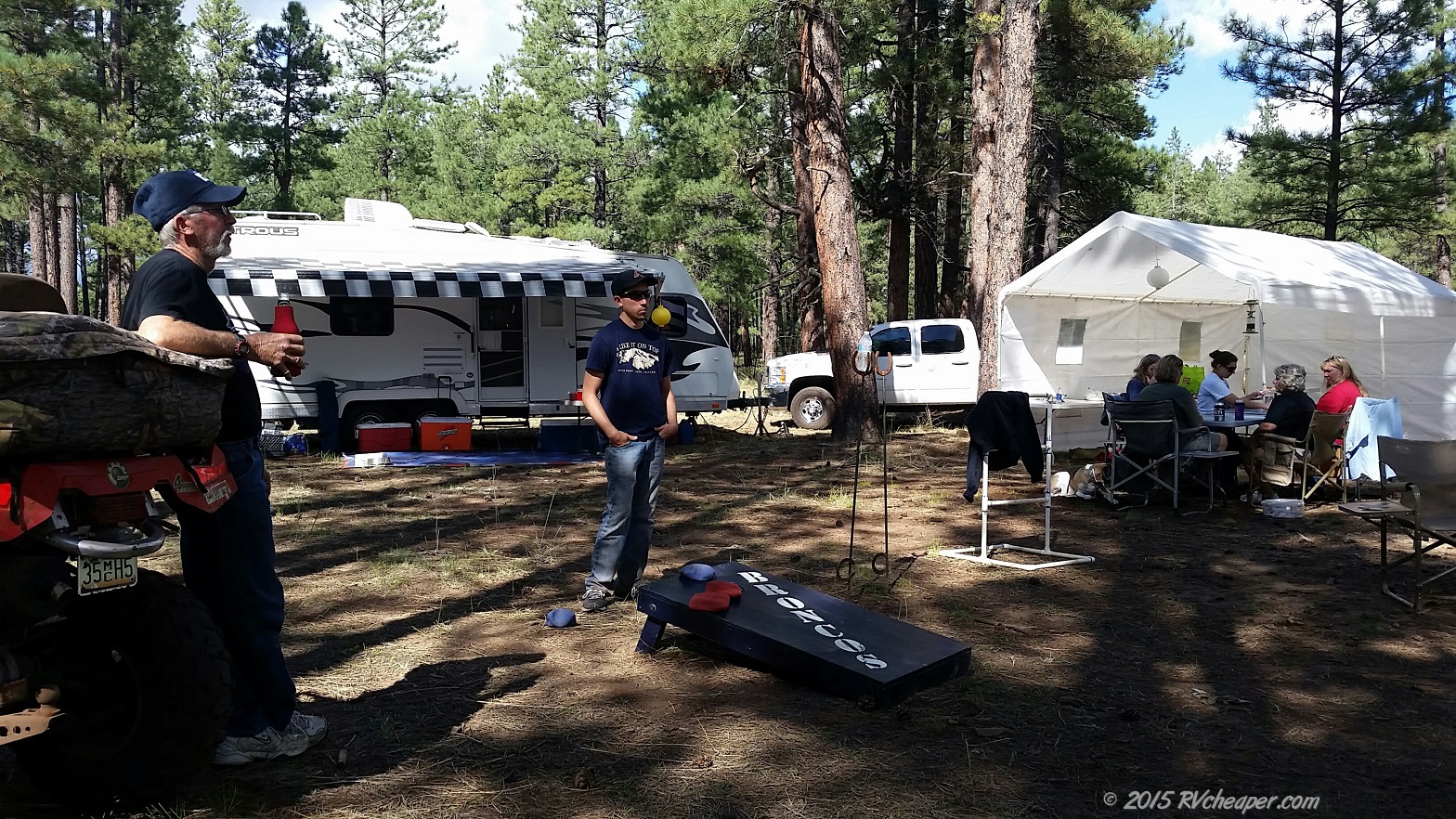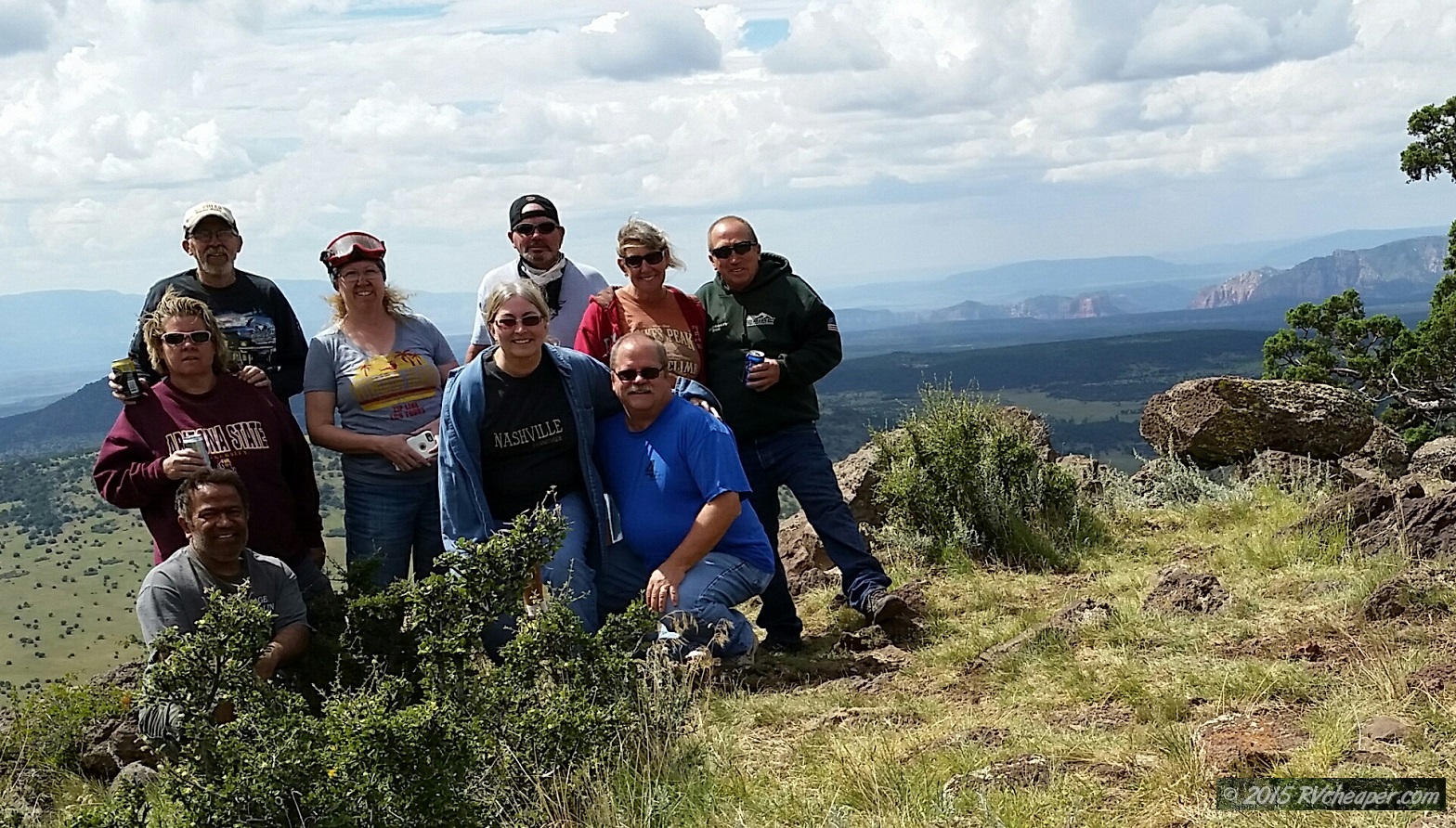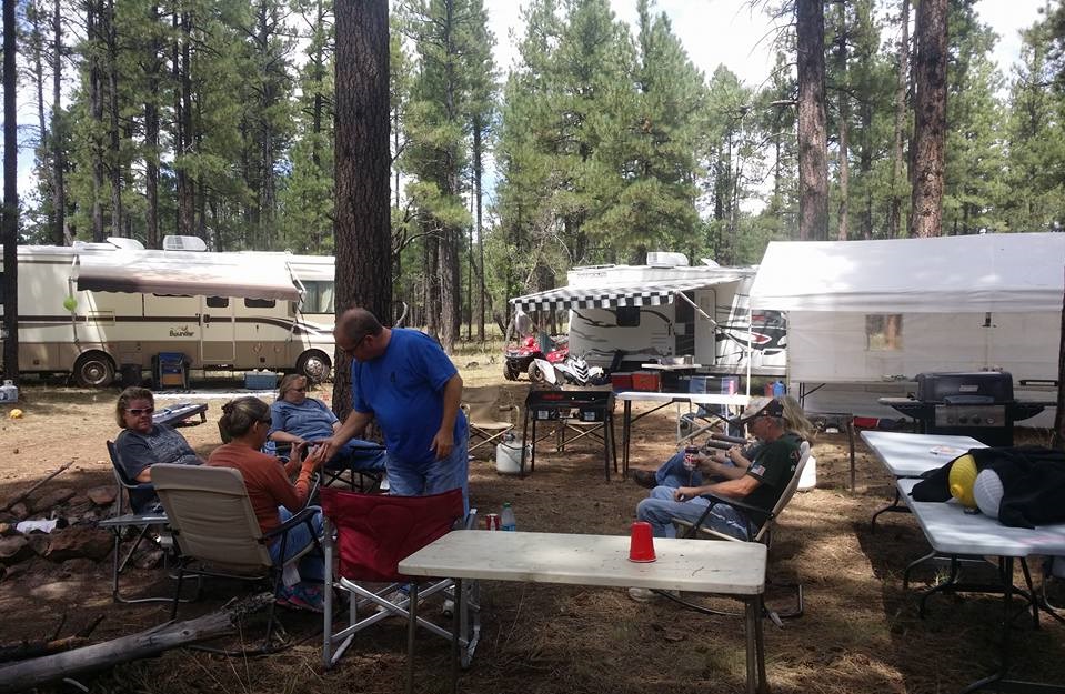 The forest roads were quite wet on Wednesday and in one section of the road was very slippery red clay, there was little if any gravel for traction. Going up part of one incline I was turning left with the rear of the RV wanting to come up along the left side. I never had any worry about getting stuck, but it was very weird drifting in a 23,000 pound RV…We have not had our ATV with us on a trip in quite a long time, it was great to get out riding again!Dan & Mel brought their sand rail on this trip, it has long travel suspension and a turbo charged GM V6. What an awesome ride this was!One of our rides was out to Apache Maid Lookout, the views are at least 80 miles in all directions across the Coconino, Apache and Prescott National forests. Today we missed getting to the gate before the rangers went to lunch so our view this time was limited to the west.The distant mountain near the center is Sedona and to the right is Oak Creek Canyon.A small portion of the happy Hour crew posing with Sedona in the background.Alice & I posing with Jerome at the foothills of the distant mountains over my shoulder.On the way back from Apache Maid Lookout we took a detour down a powerline road. One of the rockiest trails I’ve ever been on and Charlotte hit a boulder that made her right foot slip off the peg and the rear tire rode up the back of her leg tearing the ACL. Not knowing how bad the injury might be we had an ambulance take her to the Payson hospital.Charlotte on the left with a new ACL injury, posing with Jessica who just had surgery to repair an ACL just 3 weeks earlier (hers was from a steer not an ATV 🙂 )Chasing the shade and sharing picturesDan and Chris on opposing teams on one of the many Corn Hole games…Bill and Andrea teamed with Dan and ChrisAndra, Jessica and Jasonstill going…after supper gathered around the campfire (those Colorado firemen tend a mighty fire)Several LED light globes adorned the campsite. One of the great things about boondocking is no 9:00pm quiet curfew.yes, more Corn Hole by lantern…Alice playing a little Suduko by the fire.