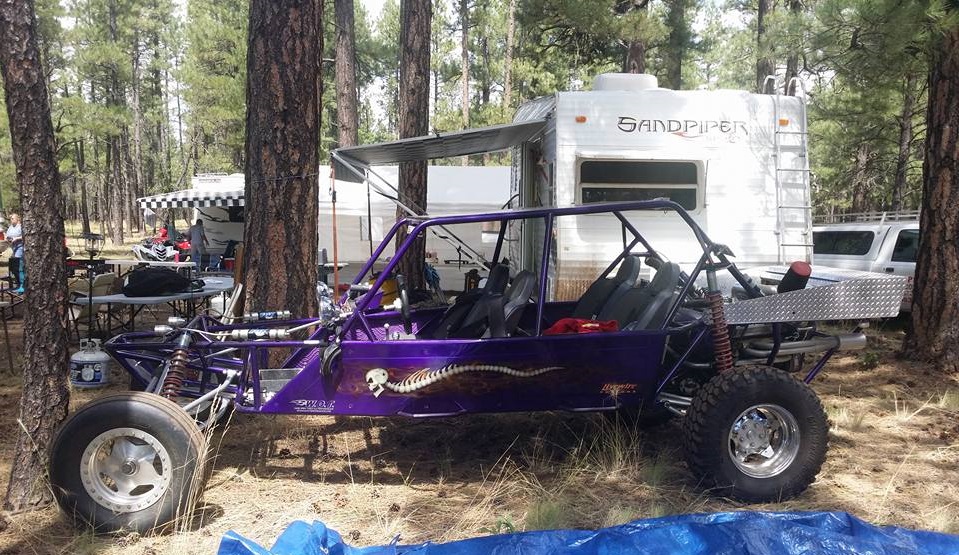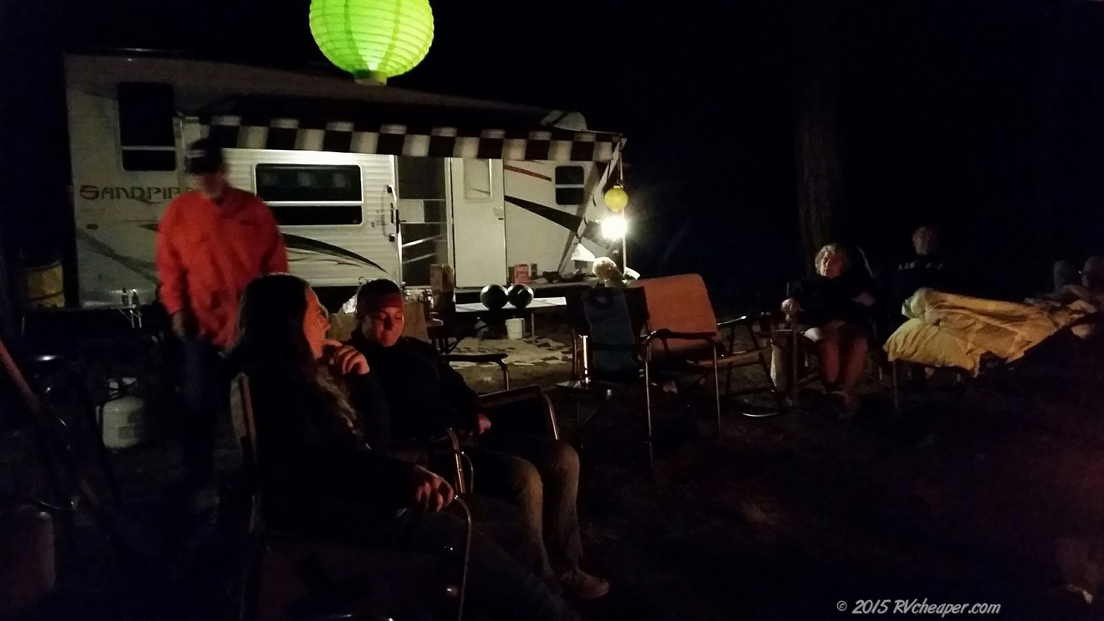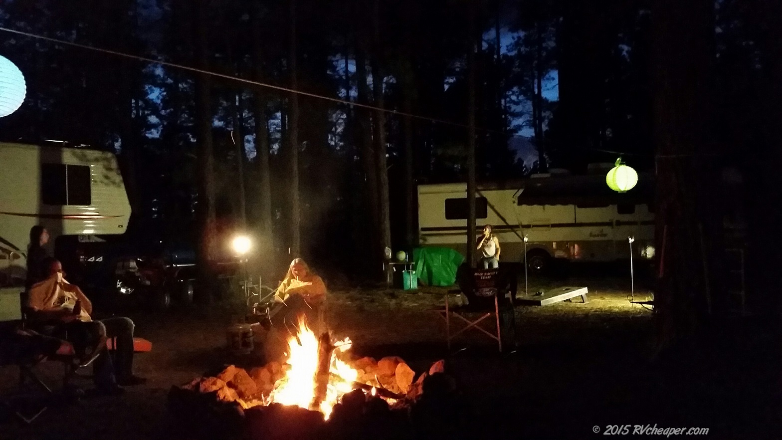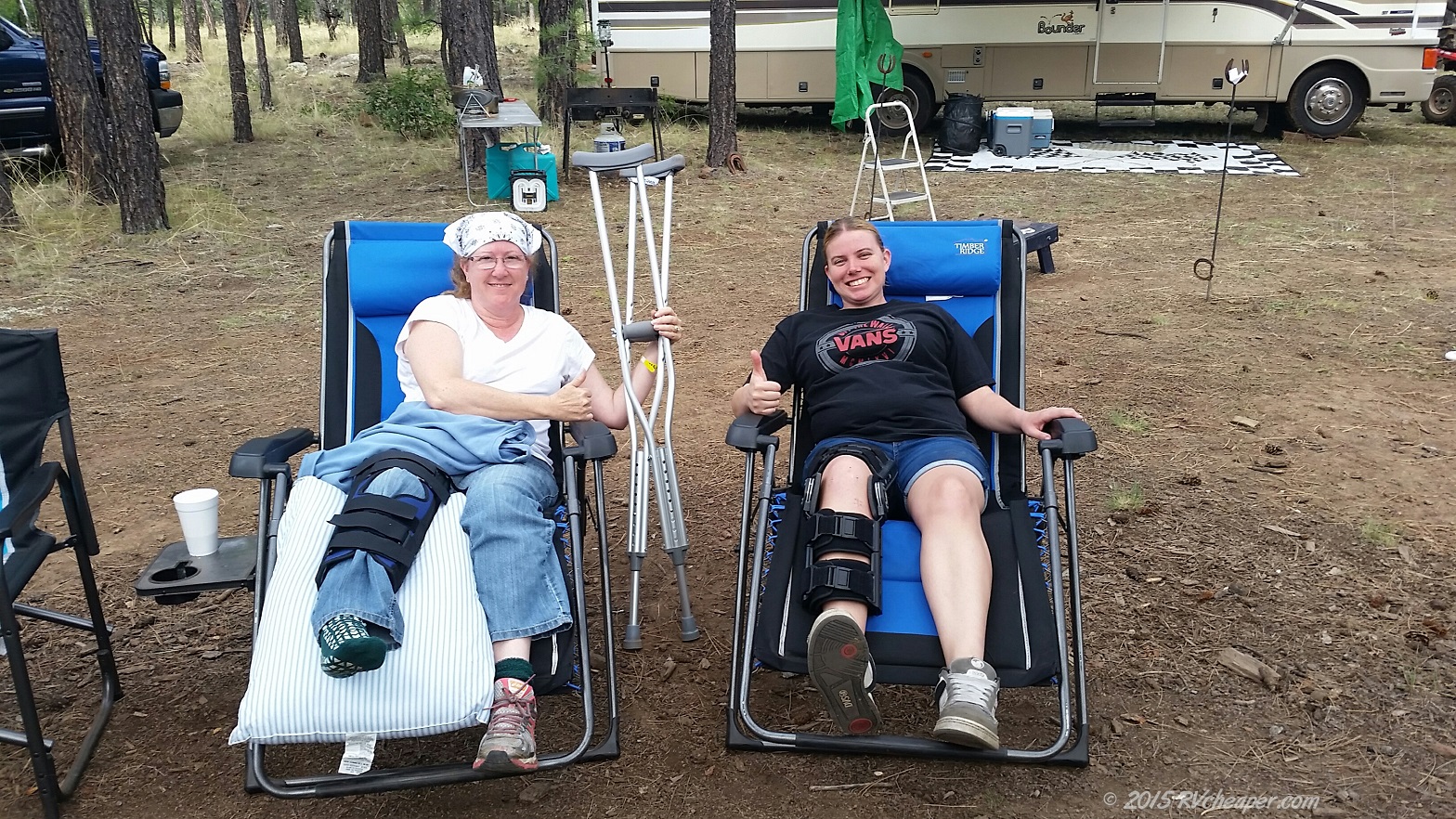 The forest roads were quite wet on Wednesday and in one section of the road was very slippery red clay, there was little if any gravel for traction. Going up part of one incline I was turning left with the rear of the RV wanting to come up along the left side. I never had any worry about getting stuck, but it was very weird drifting in a 23,000 pound RV…We have not had our ATV with us on a trip in quite a long time, it was great to get out riding again!Dan & Mel brought their sand rail on this trip, it has long travel suspension and a turbo charged GM V6. What an awesome ride this was!One of our rides was out to Apache Maid Lookout, the views are at least 80 miles in all directions across the Coconino, Apache and Prescott National forests. Today we missed getting to the gate before the rangers went to lunch so our view this time was limited to the west.The distant mountain near the center is Sedona and to the right is Oak Creek Canyon.A small portion of the happy Hour crew posing with Sedona in the background.Alice & I posing with Jerome at the foothills of the distant mountains over my shoulder.On the way back from Apache Maid Lookout we took a detour down a powerline road. One of the rockiest trails I’ve ever been on and Charlotte hit a boulder that made her right foot slip off the peg and the rear tire rode up the back of her leg tearing the ACL. Not knowing how bad the injury might be we had an ambulance take her to the Payson hospital.Charlotte on the left with a new ACL injury, posing with Jessica who just had surgery to repair an ACL just 3 weeks earlier (hers was from a steer not an ATV 🙂 )Chasing the shade and sharing picturesDan and Chris on opposing teams on one of the many Corn Hole games…Bill and Andrea teamed with Dan and ChrisAndra, Jessica and Jasonstill going…after supper gathered around the campfire (those Colorado firemen tend a mighty fire)Several LED light globes adorned the campsite. One of the great things about boondocking is no 9:00pm quiet curfew.yes, more Corn Hole by lantern…Alice playing a little Suduko by the fire.