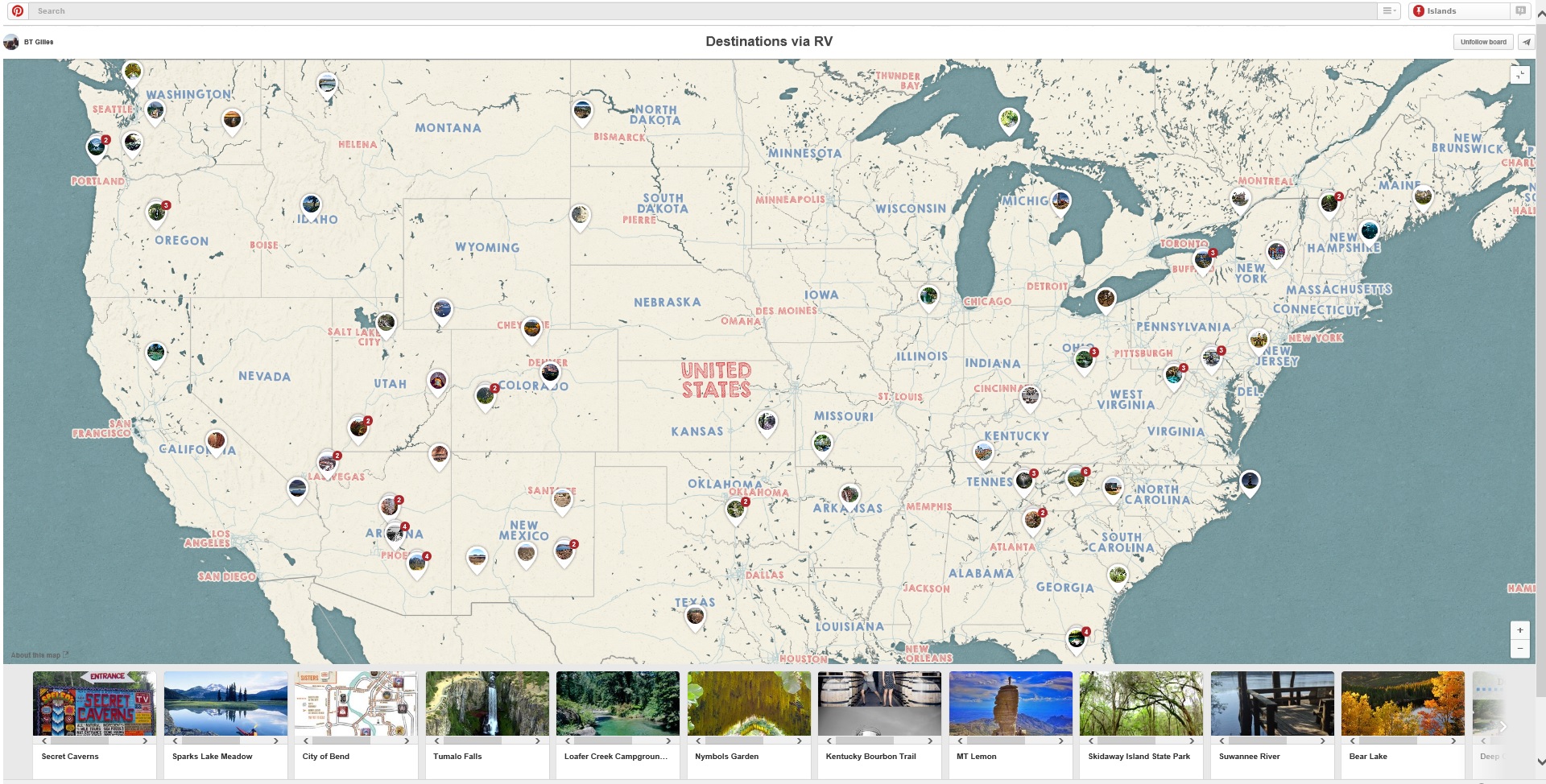 Pinterest has turned out to be an awesome way to organize and map photos of places I’ve been to and places I’d like to see. With the map on Pinterest I can zoom in on the areas we are travelling to and get some great ideas on the fly rather than trying to plan too far ahead. With 650 locations as of October 2015, I thought I’d share it with you just in case it helps you too. You zoom into an area and click on the little bubbles to see photos pop up along with a website link to a local RV park or attraction.