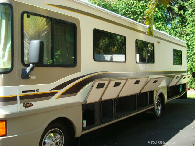 One of the features on my RV shopping list was basement storage, as big, as much as I could get. One of the things I loved about the Bounders were the big compartments and basement doors. Granted the gas RV basements don’t hold a candle to the Diesel RV’s, but the Bounder is one model that had some of the biggest basements I could find.