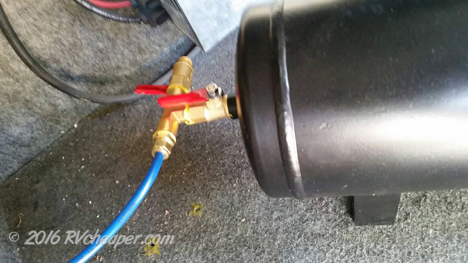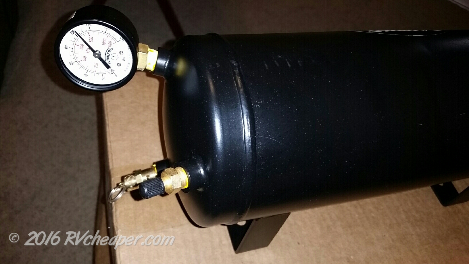 Once I assembled the tank, fittings, valves and gauge, I did an under water leak check. The only leaks will be the fittings under the RV until that gets my attention in cool weather.