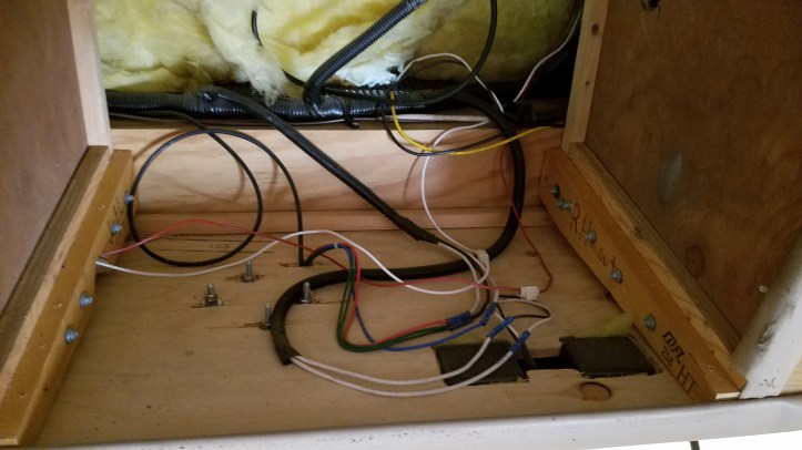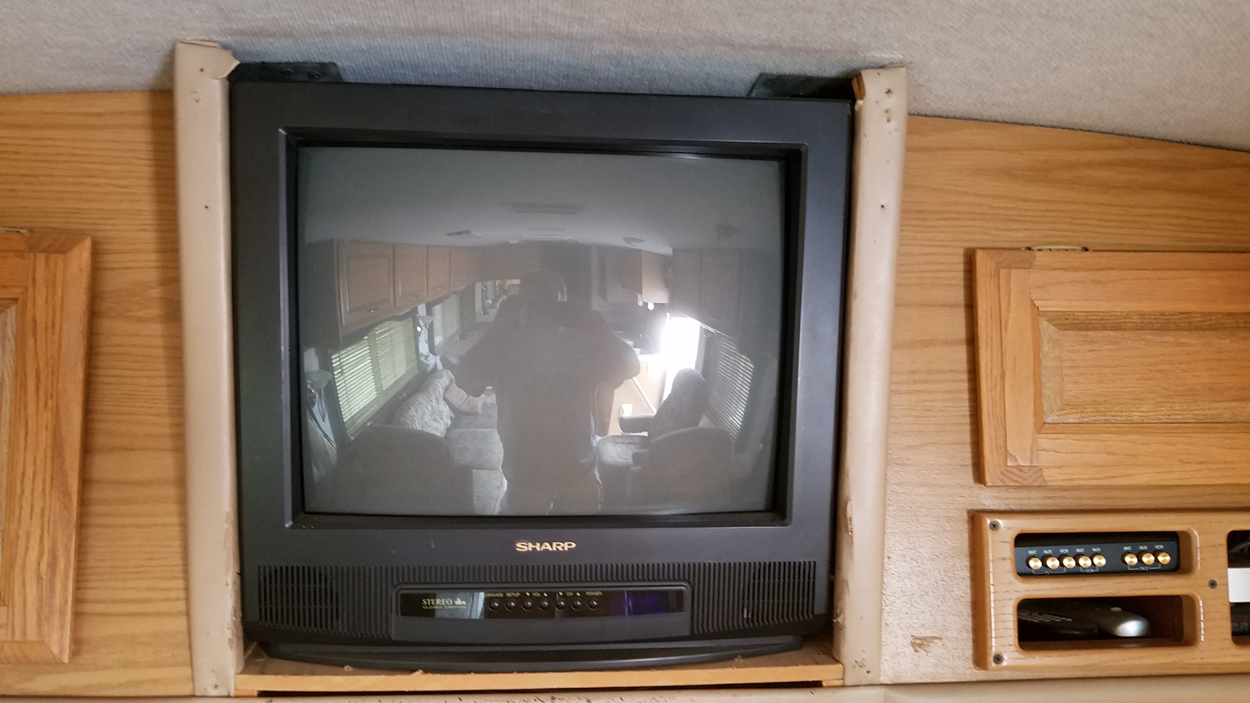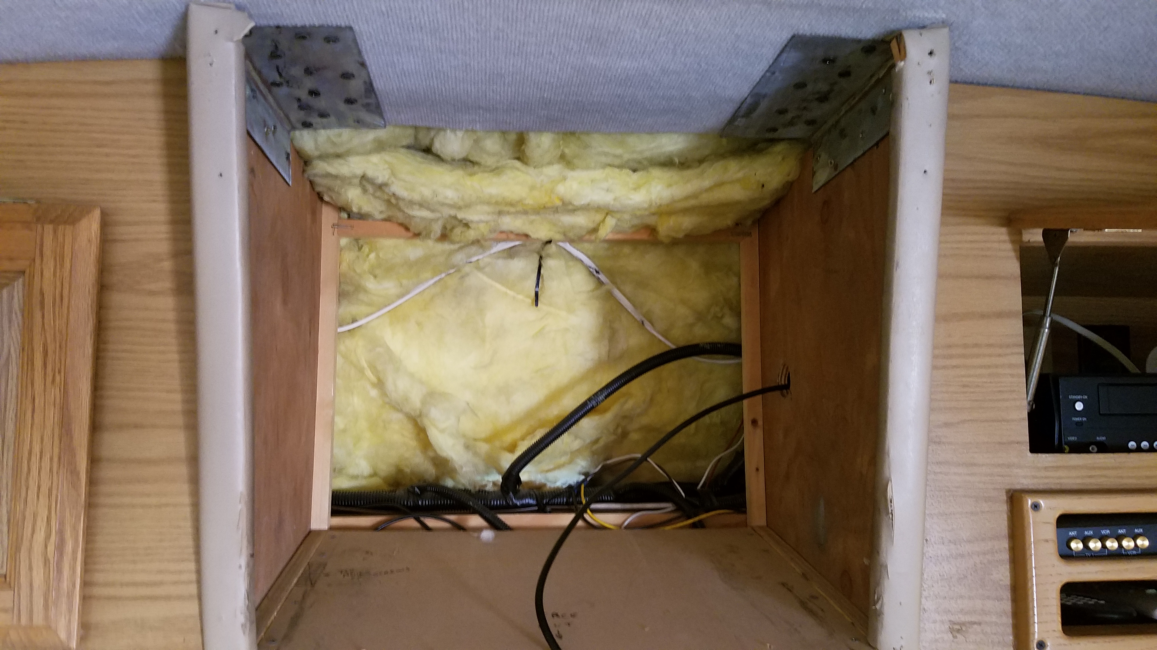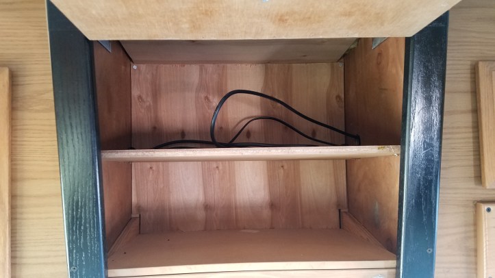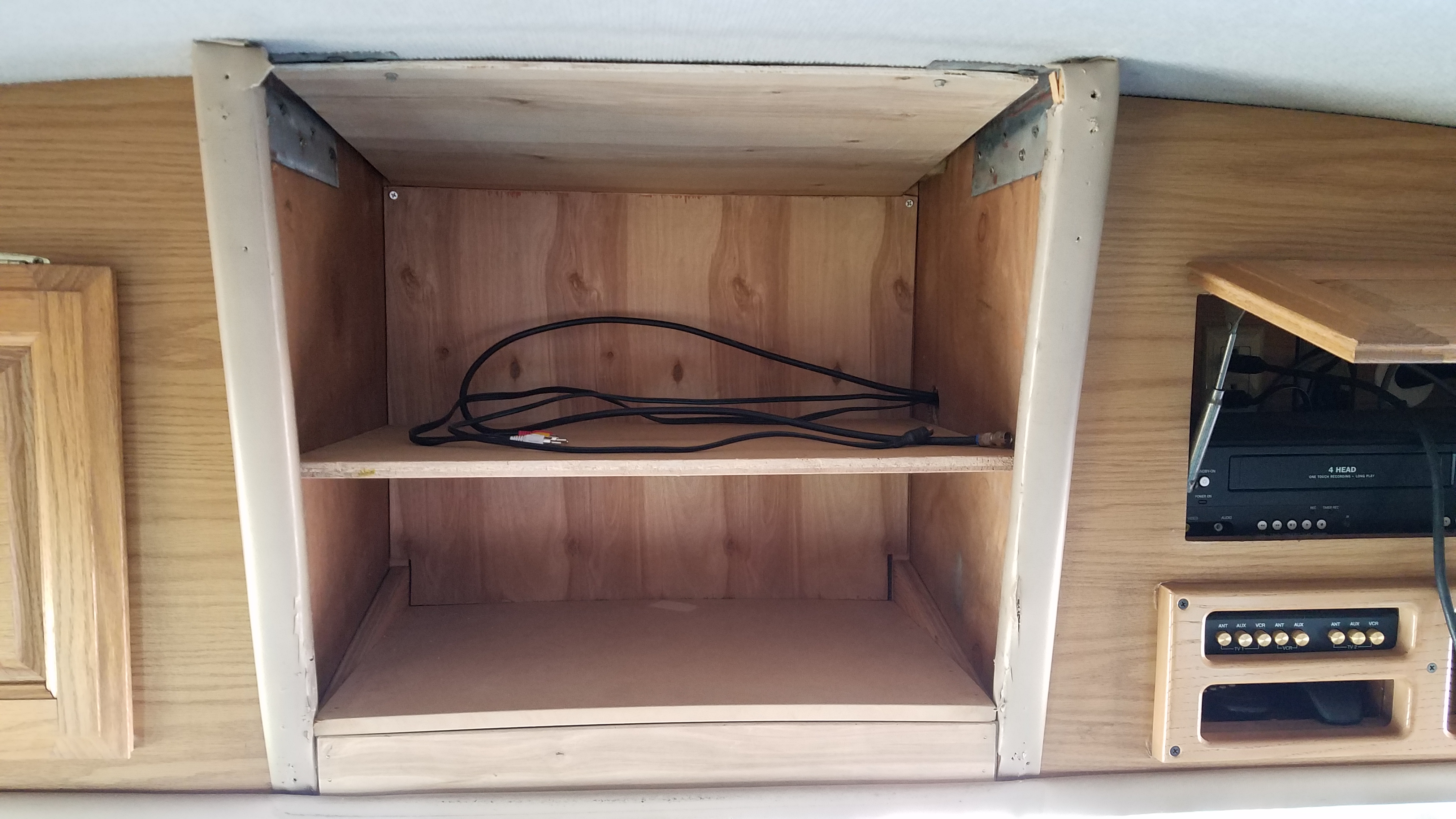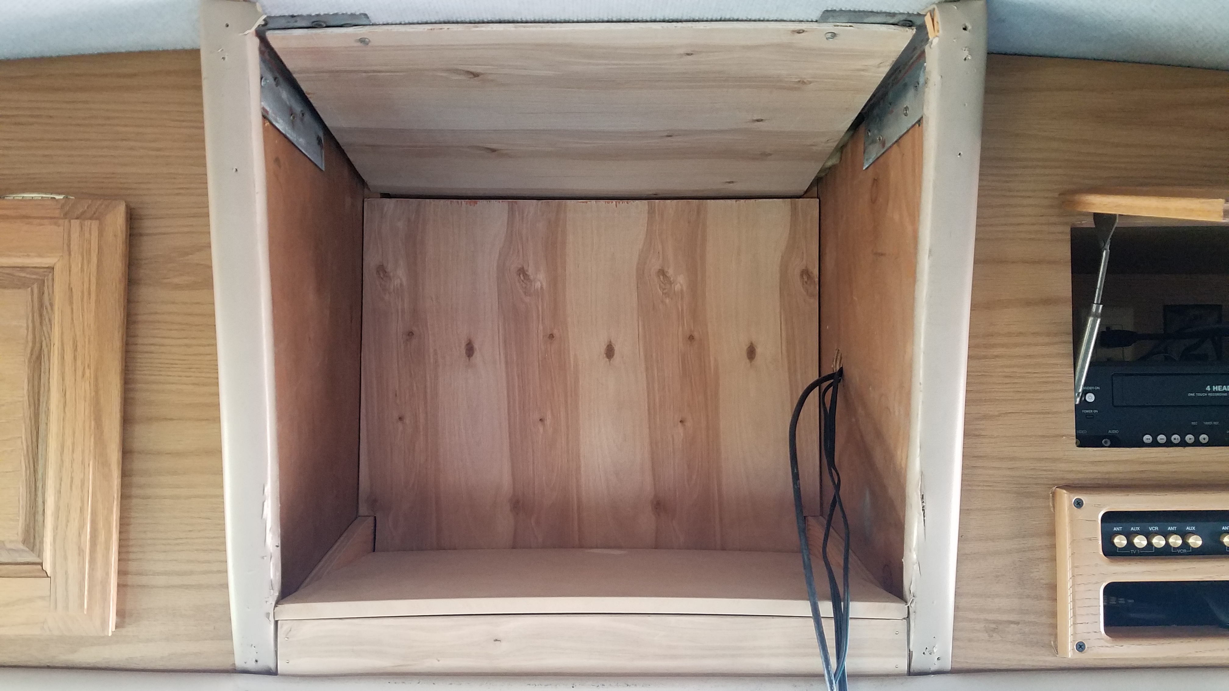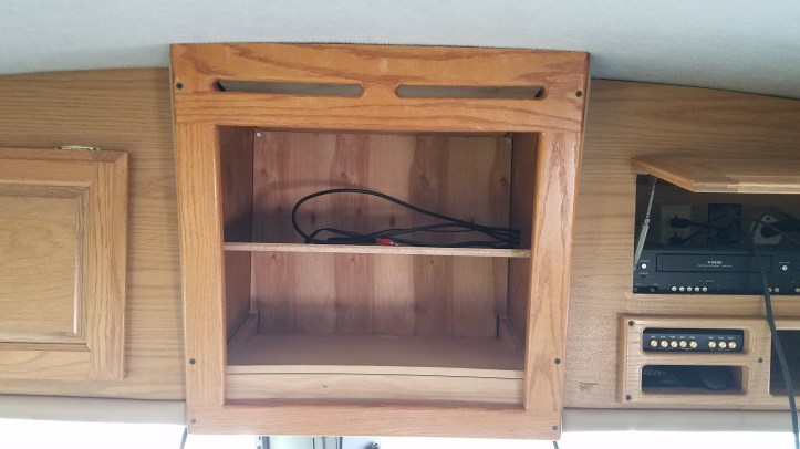 Here’s the old dinosaur with the face plate removed, I was so anxious to get this replaced!Nice big cavity to become new storage. The bottom shelf is at an angle so I’ll need to make a new level shelf to take it’s placeI decided to swap and flip the shelf braces on the sides to get a level bottom shelf and provide clearance for the wires, dash lights and rear view camera bolts…The bottom shelf is almost level after switching the inner braces, the outer braces that were level with the shelf before, are showing now but, that’s an imperfection I can live with. I added 1/4″ paneling on the top and back to hide the insulation and gaps in ceiling trim that were hidden by the old TV.I added a middle shelf since storing tall items in here would be unruly in this space, no point in giving myself that opportunity!