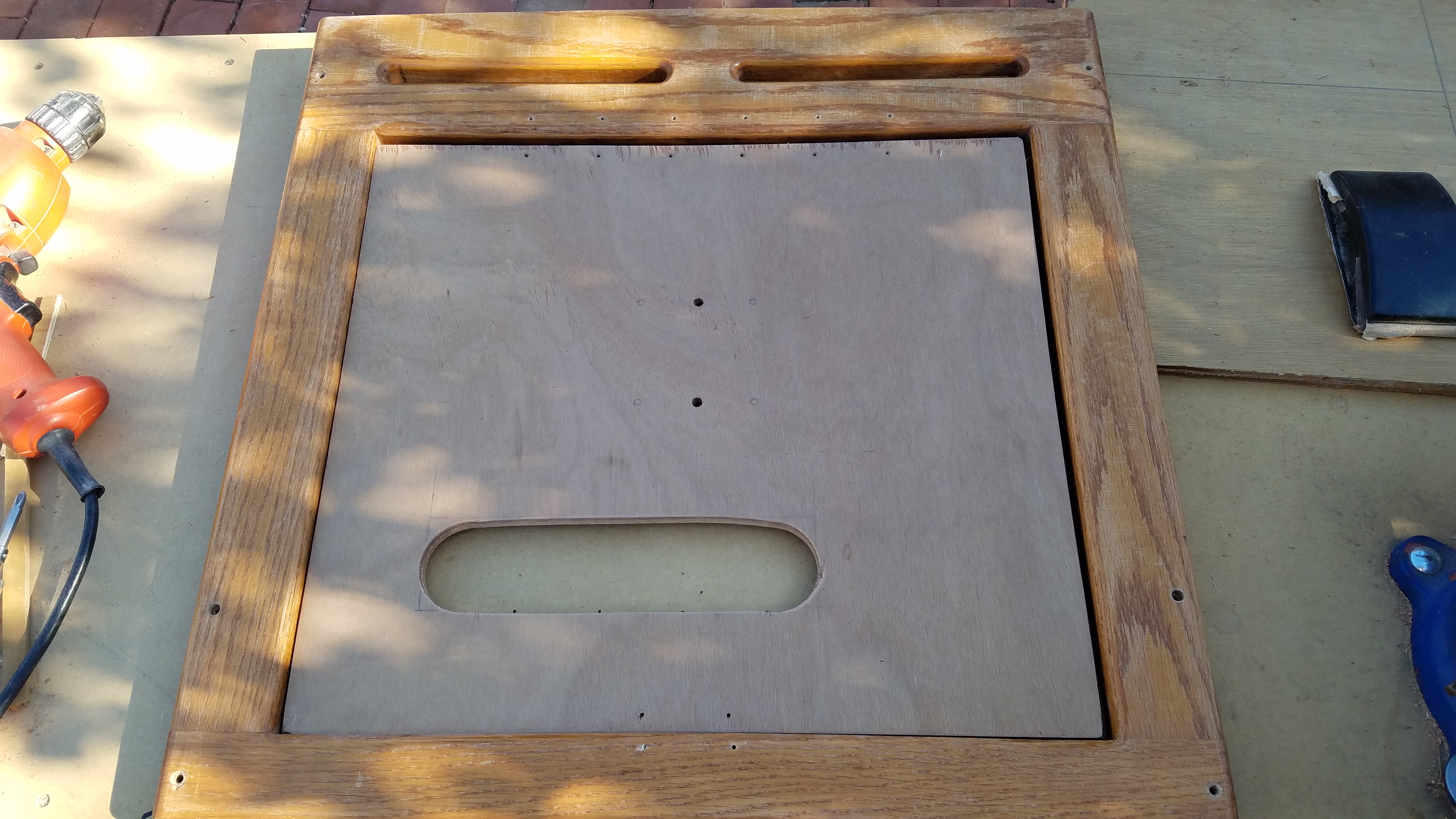 I added 2 metal brackets on the drivers side to anchor the face plate to the wall, the little 1″x2″ trim was not going to keep the flat panel and face plate from ripping out of the front. I had to add a long screw to anchor the faceplate. The black screw from the front of the faceplate ended up going into the bracket for extra support!I added 2 more metal brackets on the passenger side to anchor the face plate to the wall. This side didn’t line up with the black screws from the front so the long one from the back will have to take the load.Now it was time to fit a door for mounting the flat panel onto and I added a big, big hole for wires to pass through…With the hinge and door mounted, I tested range of motion and access to the shelves.