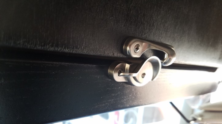 Now that everything was test fit and my mistakes fixed, I painted the door. I decided on black to blend in with the flat panel TV since there was no way to match the original wood finish. At this point I was doubting this decision, especially with the stainless hinge so shiny. But I don’t want to trust paint to stick and not peel off after opening several times… 🙂