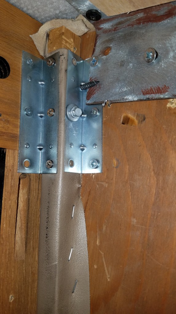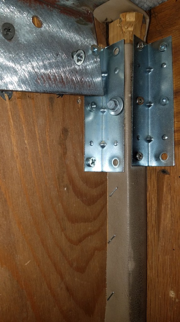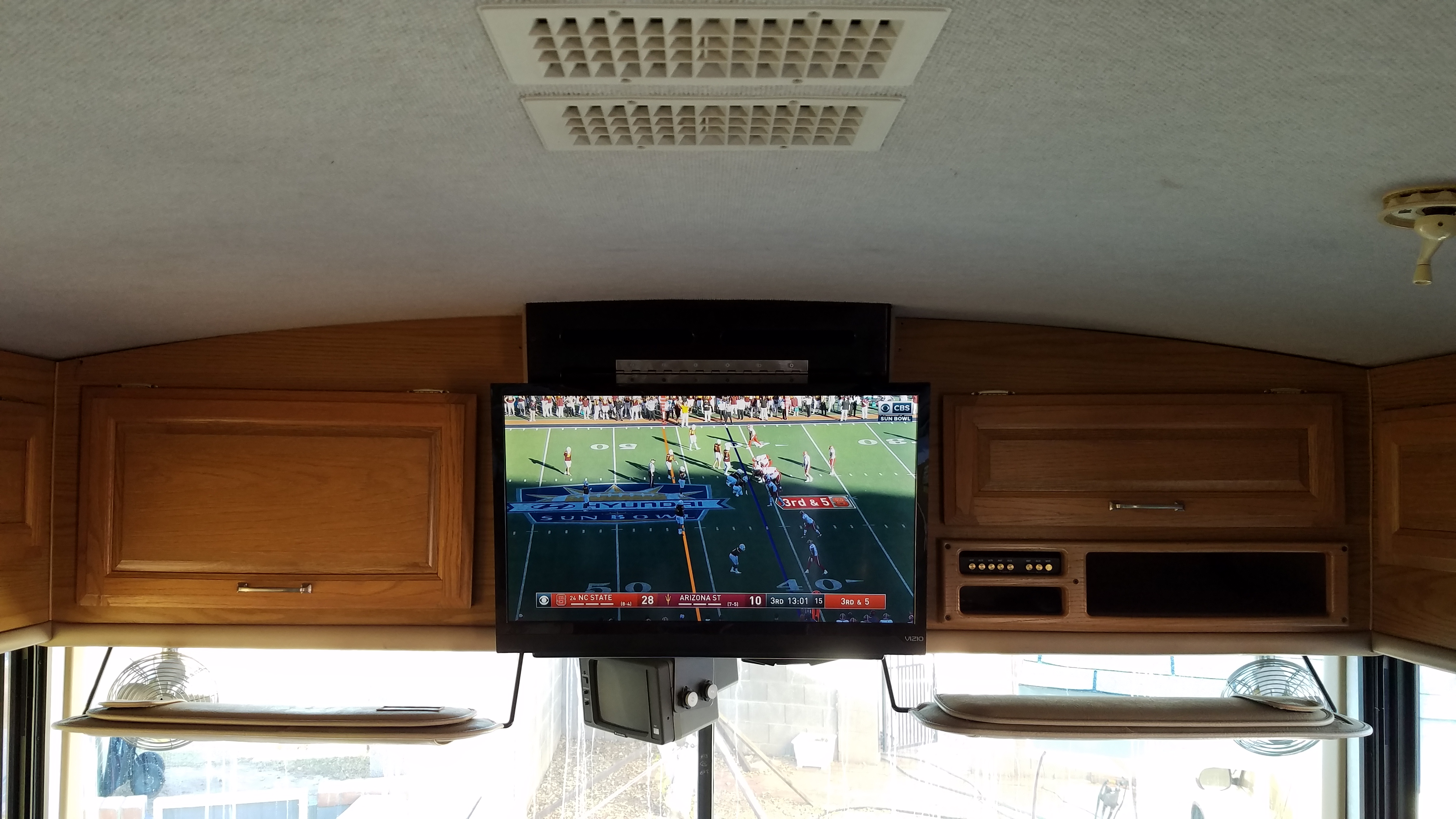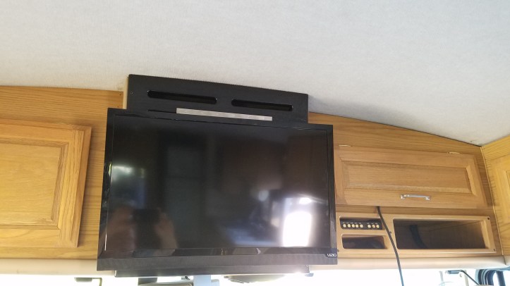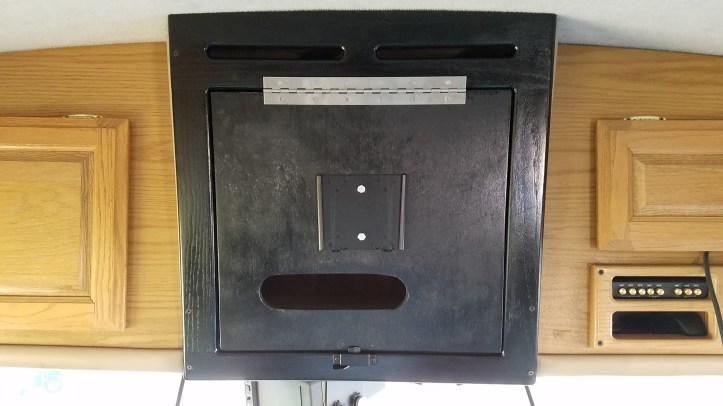 I had an extra flat screen we weren’t using so I decided to ditch that old dinosaur glass TV and Digital TV converter I had to use with it. Switching to a flat screen also opens up a bunch of storage space even though it was only a 15′ TV. I had to burn a few brain cells to come up with how I wanted to mount it. I bought a swing-up ceiling mount to let me swing the TV up for access to the new storage bin where the old TV sat. The swing-up mount posed all kinds of problems so I returned it. As usual I had to go back to the drawing board and finally came up with a swing up door idea that used a much simpler and cheaper bracket (paid $9.99 on Amazon). I was able to fit our odd size 29″ flat panel between the existing cabinet doors. We have an entertainment center for the master bedroom that could not fit a 32″ TV and our kids found a 29″ that they gave us for Christmas a few years back. With much of the furniture in storage, I figured I could use the 29″ in the RV until we need it at home again and then I’ll probably put a 27″ in the RV if I can’t find another 29-30 inch screen later for the RV.