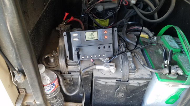 I’m going to get some aluminum brackets and hinges at Homie’s or Lowes so I can keep them assembled with the glass sides facing inward during storage. If I can find a way to make a home made suitcase work out, I’ll also make a permanent setup for the charge controller so I get more juice into the batteries than I’m getting with the super cheap alligator clips that came with the charge controller.