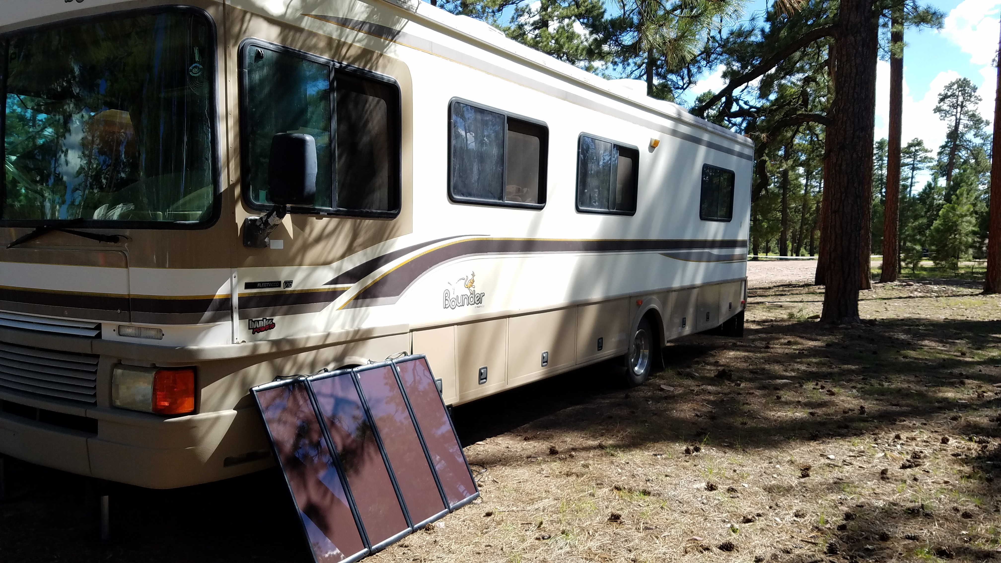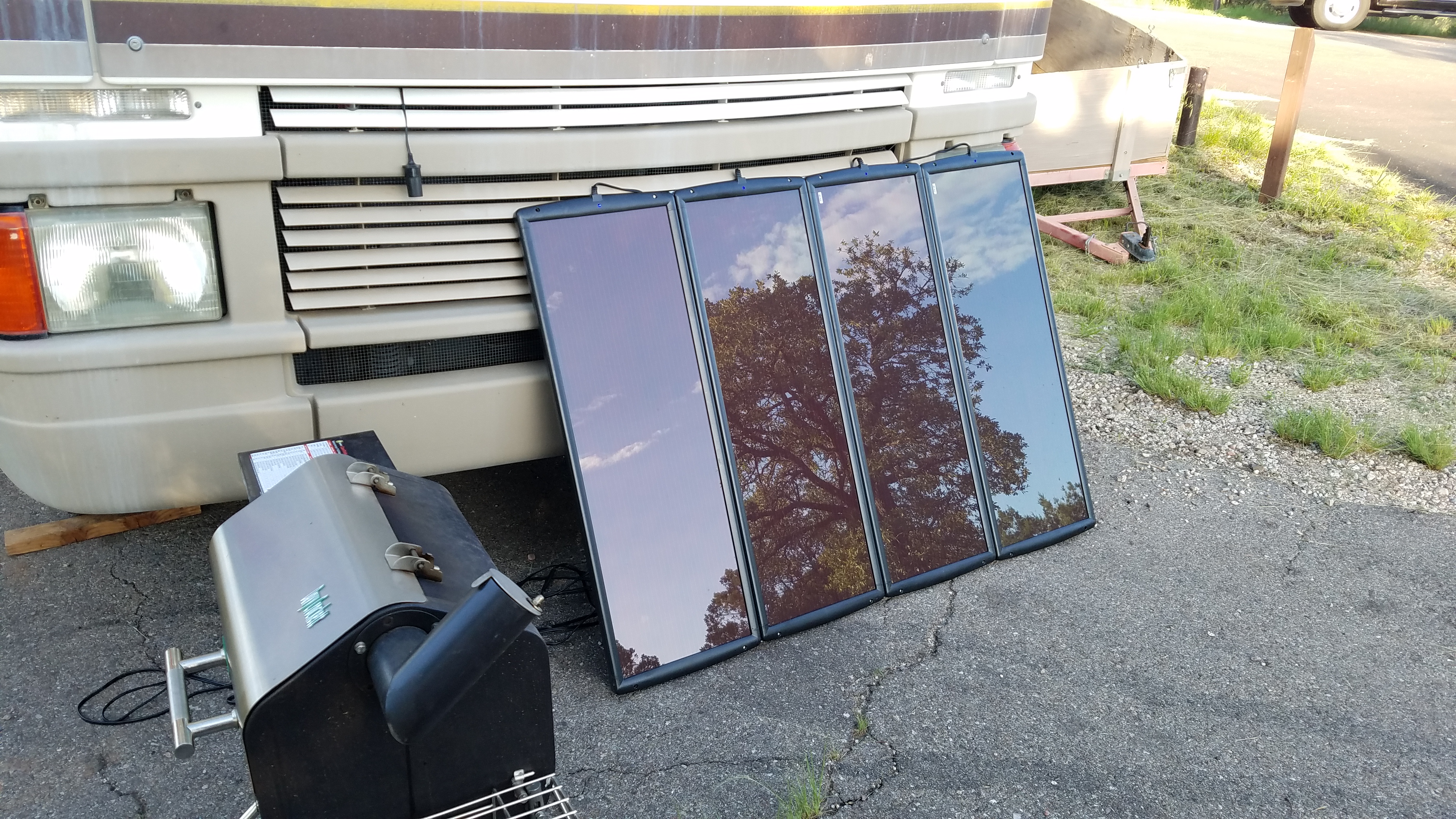 I do like being able to park where I want with shade and then tote the panels to where ever the sun is shining. If I had panels on the roof I’m not sure how much sun we’d get with my love of shade for the RV. Since we don’t have a big residential fridge (for now) and we don’t go where we need A/C when boondocking, I’m definitely staying with a 100 watt portable setup. If I can make a good solar suitcase great, if not I might sell these panels and splurge on the Renogy setup later on.
