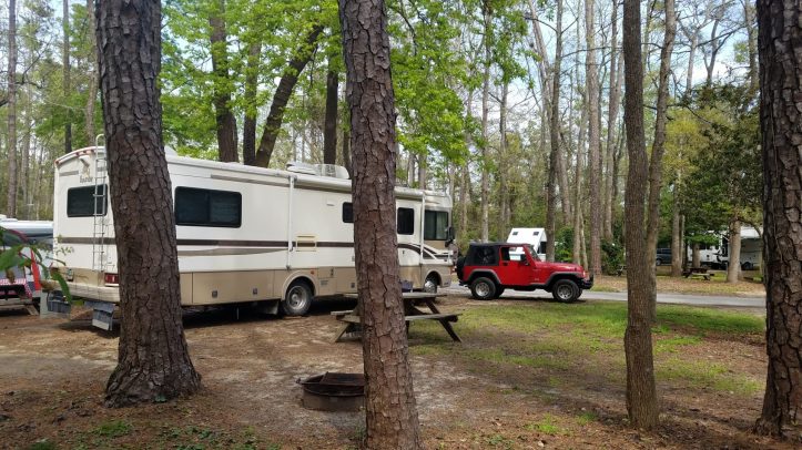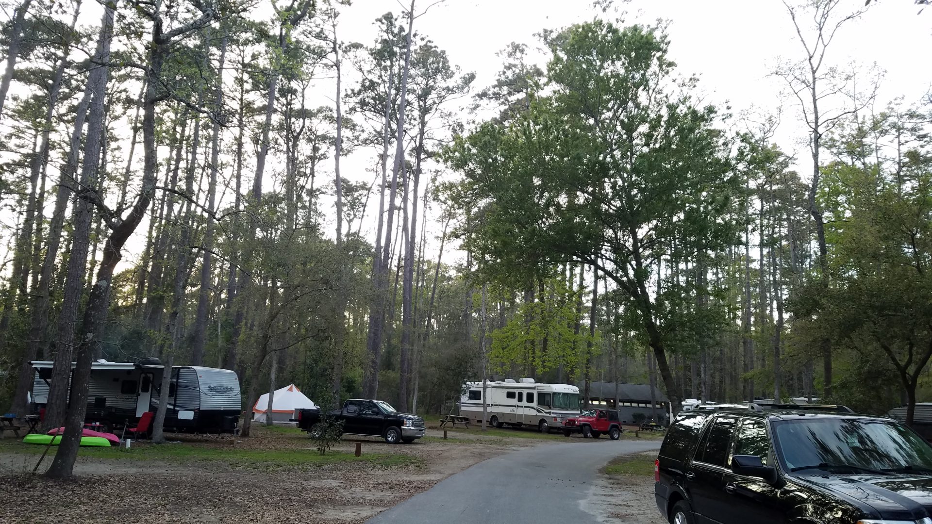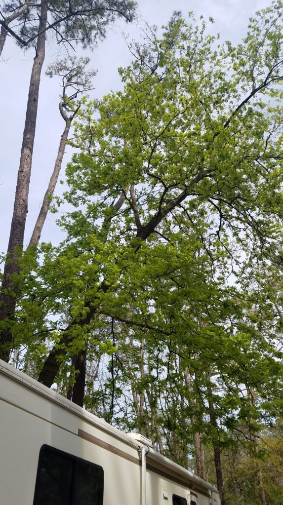 The great Chamber of Commerce weather continues here at Myrtle Beach but a short rain shower did sneak in with some wind and cleared up as fast as it came. Heard a big thump on the roof and once the rain passed I went out and found piece of tree branch at the edge of the roof. I went to the park office and a ranger came over with a ladder so I could check it out. I was surprised he let me use the ladder but I didn’t want either of us worrying about him tearing the roof to remove the branches. One of the branches was pretty long branch on the roof with some sharp edges, but no damage to the roof, whoo-hoo!