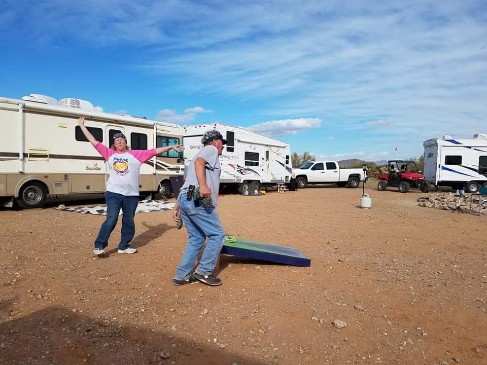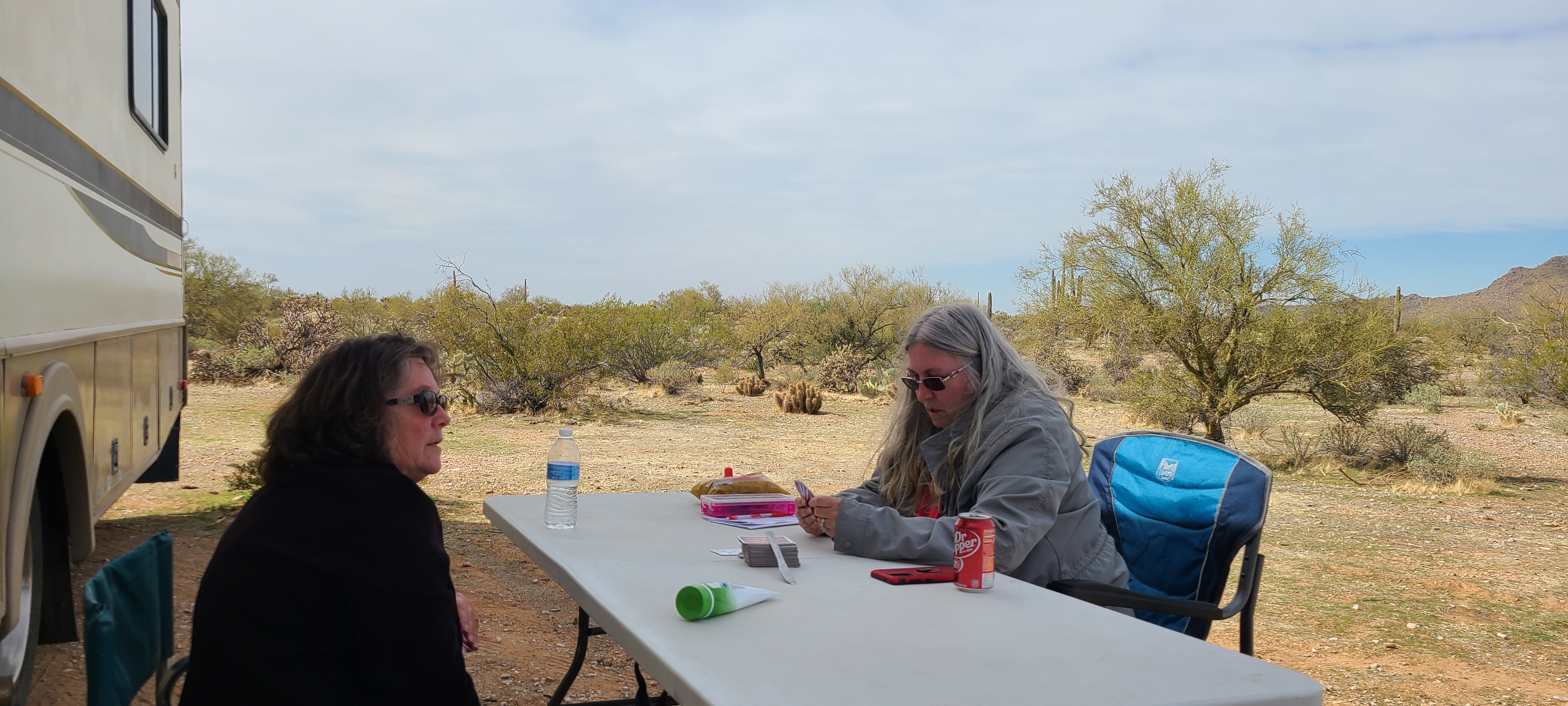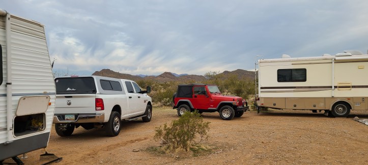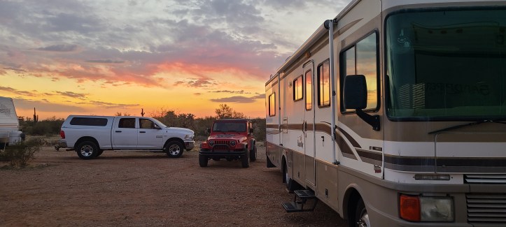 I could get used to these camping trips at least once a month, almost quenching my thirst for a repeat of our 2019 trip. Even getting 20 miles out of town is a welcome change! We went dry camping with four other couples south of Queen Valley which is about 20 miles east of Apache Junction, AZ. Great sunsets, a view of city lights, really quiet out here in the desert at night and great time playing games and enjoying a campfire each night. We brought the Jeep again to go riding with friends that brought their side by side UTVs. Tacos Friday night, Steak and baked potatoes Saturday night, burgers, dogs and Steak Fries Sunday night. Breakfast was such a feast, we didn’t even eat lunch each day as planned. Not sure of the destination but we have another trip in the works for sometime in March, can’t wait!